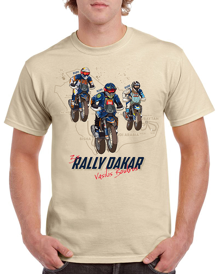 T–Shirt αφιερωμένο στους 3 τερματισμούς του Βασίλη Μπούδρου στο Rally Dakar, στο χρώμα της άμμου, από 100% βαμβάκι, στάμπα DTF, σε άνετη γραμμή. Θα το βρεις στο e-shop του 2WO.gr ενώ είναι πολύ σημαντικό πως για κάθε πώληση 5€ θα δίνονται σε φιλανθρωπικό ίδρυμα.