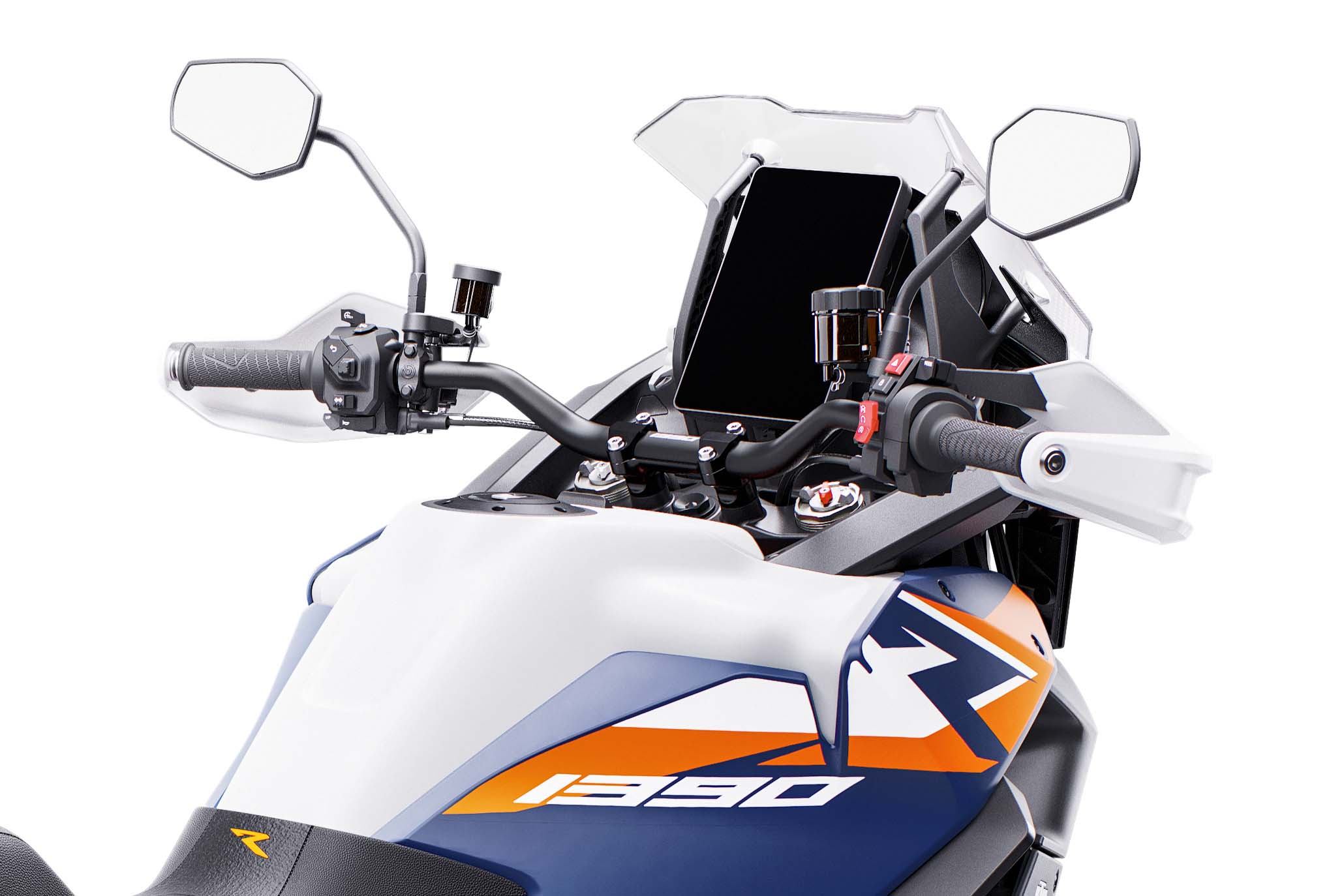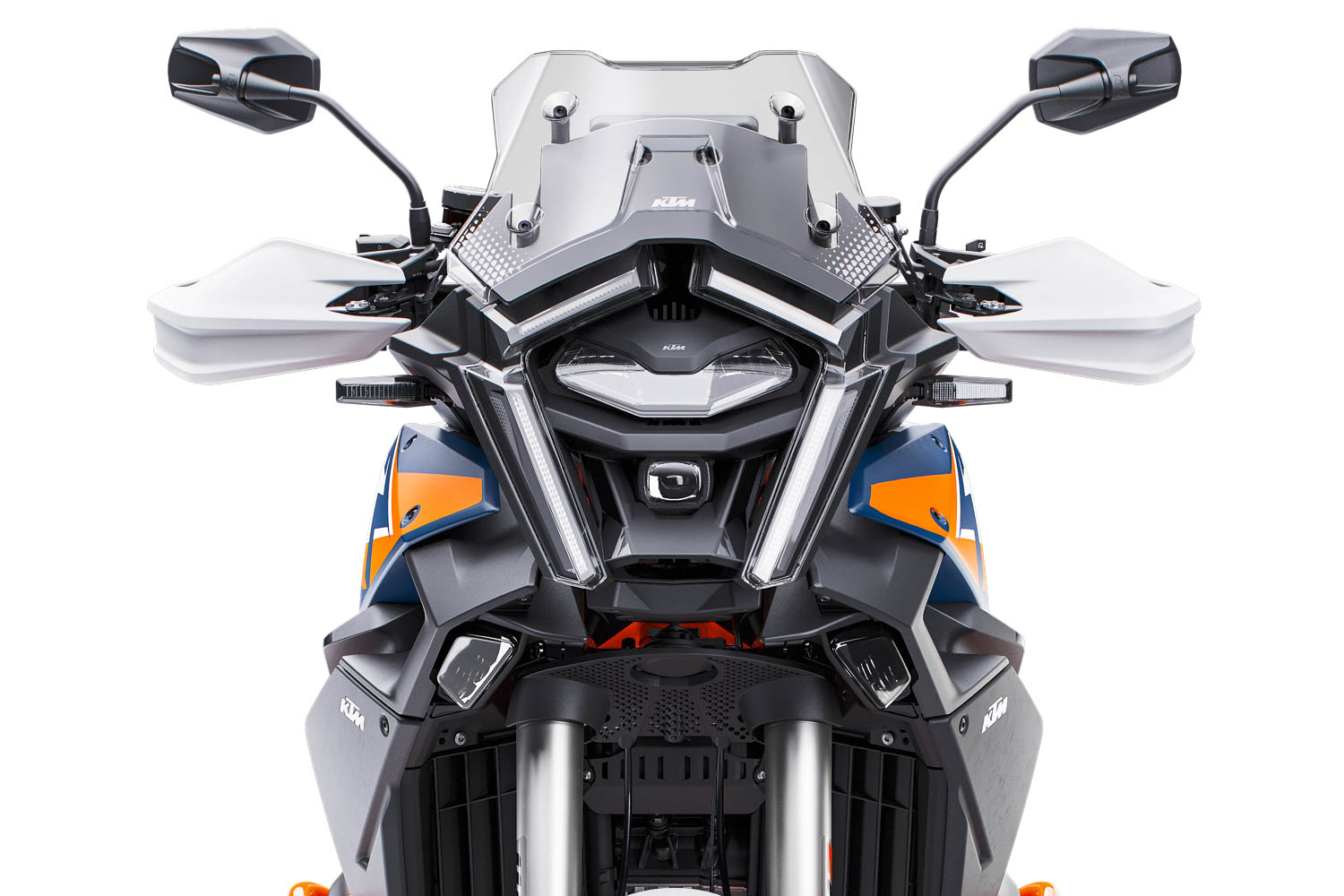 Σημαντική σχεδιαστική πινελιά, για την οδήγηση στο χώμα, είναι η τοποθέτηση μικρής ζελατίνας που φαίνεται πως δεν εμποδίζει ούτε στο ελάχιστο τις κινήσεις αλλά και την ορατότητα του αναβάτη. Φυσικά αυτό αναμένεται να έχει ως “παρενέργεια” τη μειωμένη κάλυψη από τον αέρα ωστόσο σίγουρα το 1390 Super Adventure R απευθύνεται σε πιο “σκληροπυρηνικό” κοινό. Εντελώς νέος, και υψηλής απόδοσης σύμφωνα με την KTM, είναι ο προβολές LED,, που “κάνει τη νύχτα μέρα” και ο οποίος συνδυάζεται με νέα cornering lights.