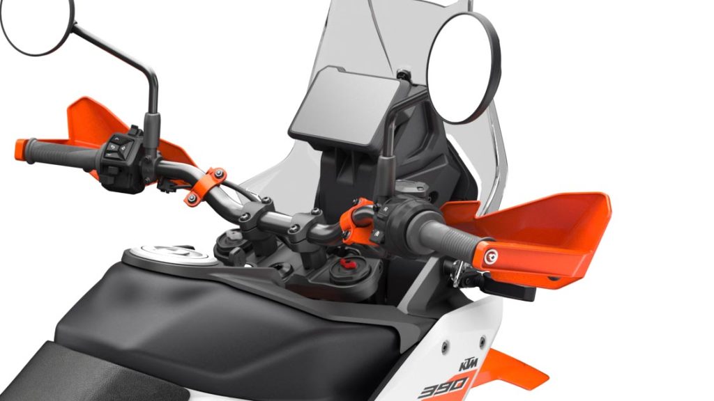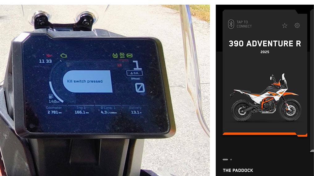 Τι να πρωτοπείς για το πολυόργανο. Πάνω από 30 σελίδες στο manual της ΚΤΜ είναι αφιερωμένες σε αυτό αναφέροντας τις δυνατότητές του και τα διάφορα mode. Από τα τρία διαθέσιμα ride mode (off-road, street, rain) “κλειδώσαμε” στο off-road όπου η απόκριση στο άνοιγμα του γκαζιού είναι πιο άμεση. Μας άρεσε ιδιαίτερα το γεγονός πως διατηρούνται οι επιλογές στα mode οδήγησης (και των ABS και Traction Control) ακόμα και μετά το κλείσιμο-άνοιγμα του κεντρικού διακόπτη. Επίσης μπορεί να συνδεθεί με smartphone μέσω της εφαρμογής KTM Connect η οποία προσφέρει έξτρα δυνατότητες, όπως η πλοήγηση (έξτρα χρέωση) μέσω της TFT οθόνης. Μάς ξένισε ωστόσο η απουσία ένδειξης για τη θερμοκρασία περιβάλλοντος…