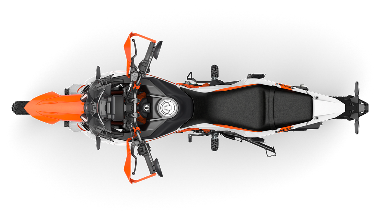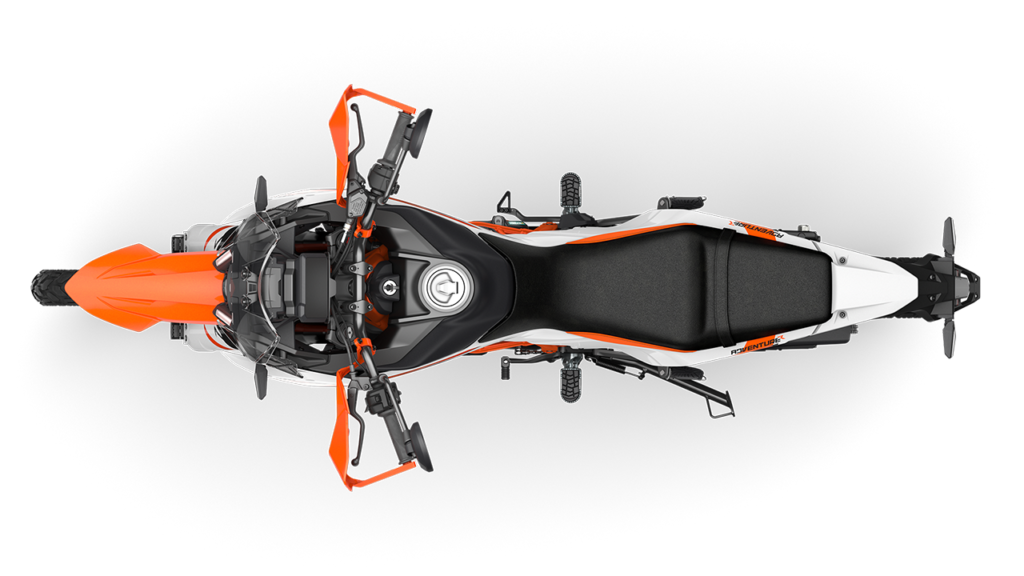 Ο συνδυασμός λευκού χρώματος στα πλαστικά με τα πορτοκαλί γραφικά και κυρίως με το πορτοκαλί πλαίσιο χωροδικτύωμα παραπέμπει άμεσα στα αγωνιστικά rally της ΚΤΜ ενώ το ρεζερβουάρ των 14lt αποτελεί κατά τη γνώμη μας τη μοναδική… παραφωνία. Αρχικά γιατί η χωρητικότητά του είναι σχετικά μικρή και σίγουρα όχι όση θα περιμέναμε ακούγοντας “Adventure” (να θυμίσουμε πως τα πρώτα KTM Adventure πίσω στο 1997 είχαν διπλάσια (!) χωρητικότητα καυσίμου) αλλά και για την επιλογή μετάλλου αντί πλαστικού για την κατασκευή του, που θεωρητικά το κάνει πιο ευαίσθητο στις πτώσεις.