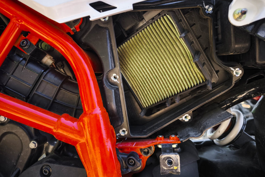 Τα βασικά εργαλεία που φιλοξενούνται κάτω από τη σέλα. Εκεί χωρέσαμε και τις λαστιχένιες προσθήκες που αφαιρέσαμε από τα μαρσπιέ.Η πρόσβαση στο χάρτινο φίλτρο επιτυγχάνεται αφού βγει το πλαινό άσπρο πλαστικό (δύο βίδες) και στη συνέχεια το κάλυμμα του φίλτρου (6 βίδες). Περιμένουμε τις aftermarket προτάσεις για πιο ελεύθερη εισαγωγή ώστε σε συνδυασμό με ένα πιο ελεύθερο τελικό εξάτμισης να επιτρέψει στον κινητήρα να αναπνεύσει (και να… εκπνεύσει) πιο ελεύθερα ώστε να τονωθεί η απόδοση στις χαμηλομεσαίες rpm.