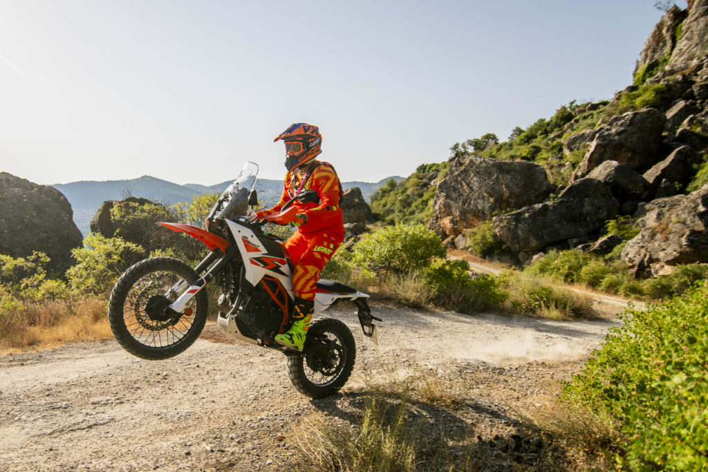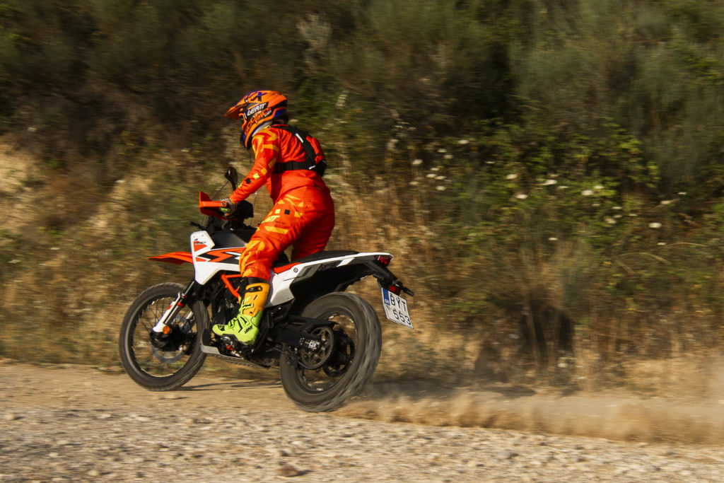 Είχαμε την ευκαιρία να οδηγήσουμε το 390 Adventure R σε μεγάλη ποικιλία τερέν και στις περισσότερες περιπτώσεις ήταν πραγματική απόλαυση. Ειδικά στο σφιχτό επαρχιακό στροφιλίκι ήταν αποκάλυψη καθώς σου επιτρέπει να κινηθείς πολύ γρήγορα, χωρίς να απαιτεί ιδιαίτερη προσπάθεια. Παρά το σχετικά μεγάλο ύψος της, διαθέτει χαμηλό κέντρο βάρους που κάνei τα 165 ονομαστικά κιλά (χωρίς βενζίνη) να δείχνουν σημαντικά λιγότερα. Πλαγιάζει πανεύκολα, αλλάζει κατεύθυνση αστραπιαία και σου επιτρέπει να κρατήσεις το γκάζι κλειδωμένο στο στοπ ενώ το Quickshifter+ (προαιρετικός εξοπλισμός) κάνει τις αλλαγές ταχυτήτων παιχνιδάκι. Τόσο πολύ που πιάνεις τον εαυτό σου πολλές φορές να το παρακάνει απλά και μόνο για να… παίξει!