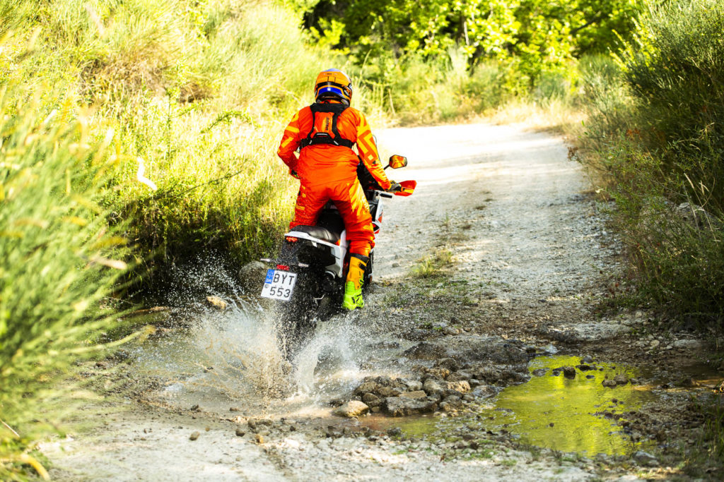 Αυτό που μας άρεσε πάρα πολύ ήταν η ευκολία με την οποία μπορείς να αλλάξεις κατεύθυνση 90 ή ακόμα και 180 μοιρών σε στενούς χωματόδρομους. Το δεύτερο μάλιστα (επιτόπου στροφή) είναι κάτι ιδιαίτερα χρήσιμο σε συνθήκες εξερεύνησης ή λάθους σε αγώνες trail ride / Rally. Εμείς το κάναμε αρκετές φορές για τις ανάγκες της φωτογράφησης και ήταν άκρως απολαυστικό! Πλασάρεις τη μοτοσυκλέτα με πίσω φρένο και περνώντας αμέσως στο γκάζι καταφέρνεις να κάνεις ορθή γωνία ή και επιτόπου στροφή ακόμα και σε χωματόδρομο μικρού πλάτους με πρωτόγνωρη, για adventure μοτοσυκλέτα, ευκολία.