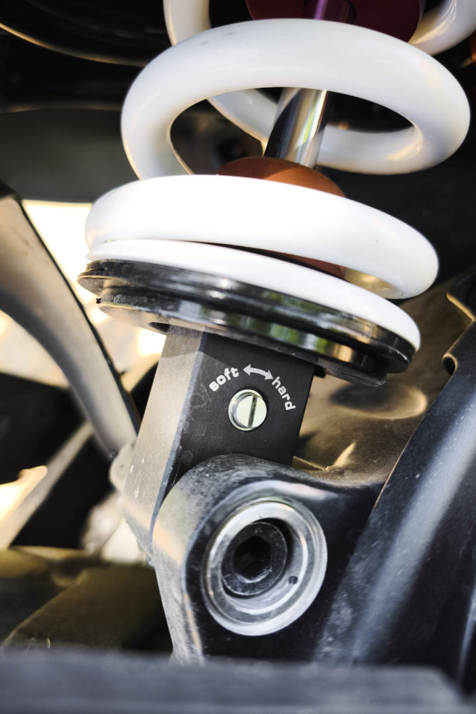 Η ρύθμιση του αμορτισέρ γίνεται από βίδα στο κάτω μέρος. Καθώς από εκεί ρυθμίζεται η απόσβεση της επαναφοράς, θα ήταν πιο σωστή η αναγραφή “fast-slow” όπως στις περισσότερες χωμάτινες μοτοσυκλέτες. Η έδραση χωρίς μοχλικό στερεί την προοδευτικότητα στις κοφτές ανωμαλίες.