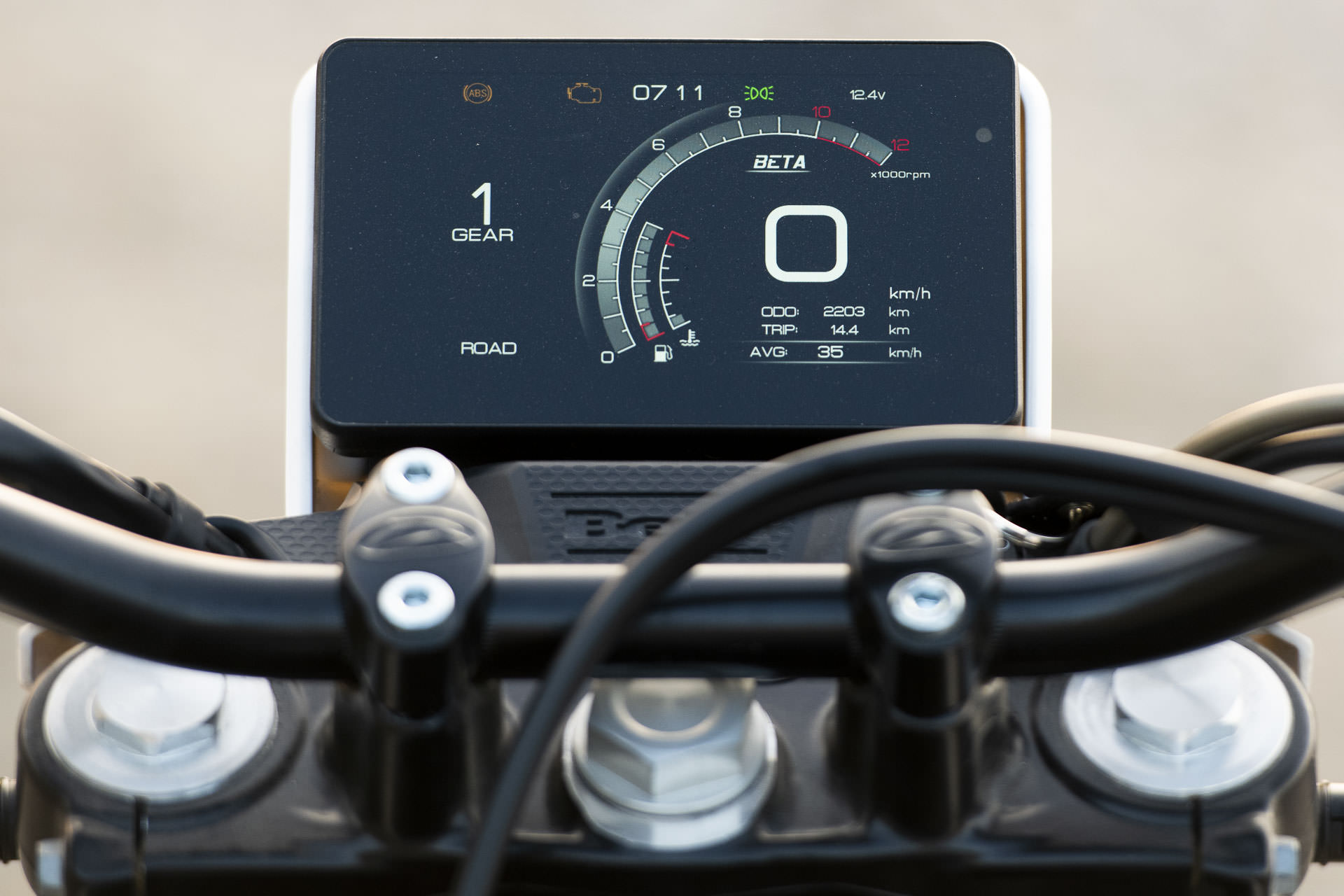 Γυρνώντας το κλειδί στον κεντρικό διακόπτη αντικρίζεις το “καλωσόρισμα” από την έγχρωμη TFT οθόνη, κάτι που για πρώτη φορά είδαμε σε μοτοσυκλέτα της Beta. Σε αυτήν απεικονίζονται όλες οι απαραίτητες ενδείξεις (ταχύμετρο, στροφόμετρο, οδόμετρο, κατανάλωση καθώς και ενδείξεις για τη στάθμη βενζίνης, τη θερμοκρασία κινητήρα, την τάση μπαταρίας και την επιλεγμένη σχέση στο κιβώτιο) αλλά δεν υπάρχει δυνατότητα σύνδεσης με άλλη συσκευή. Οι διακόπτες στο τιμόνι φάνηκε πως ήταν για τους Ιταλούς “αναγκαίο κακό” και δεν βλέπουμε κάτι ιδιαίτερα σύγχρονο, με αυτόν της μίζας μάλιστα να είναι ίδιος οπτικά με μοντέλα ακόμα και των ‘90’s. Φυσικά υπάρχει ξεχωριστός διακόπτης για την απενεργοποίηση του ABS, κάτι πολύ σημαντικό για χωμάτινη χρήση ωστόσο αυτό πρέπει να γίνεται κάθε φορά που ο κινητήρας τίθεται και πάλι σε λειτουργία.