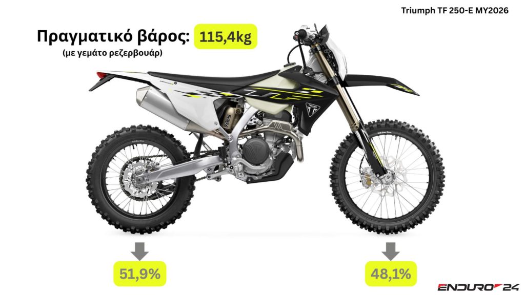 Οι ζυγαριές έδειξαν 115,4kg για τη νέα Triumph TF 250-E MY2026 με γεμάτο το ρεζερβουάρ των 8,3lt, κάτι που σημαίνει 109,3kg χωρίς καθόλου βενζίνη, “έτοιμη για χρήση”.