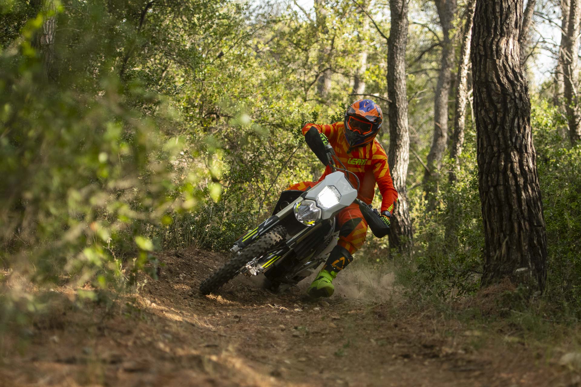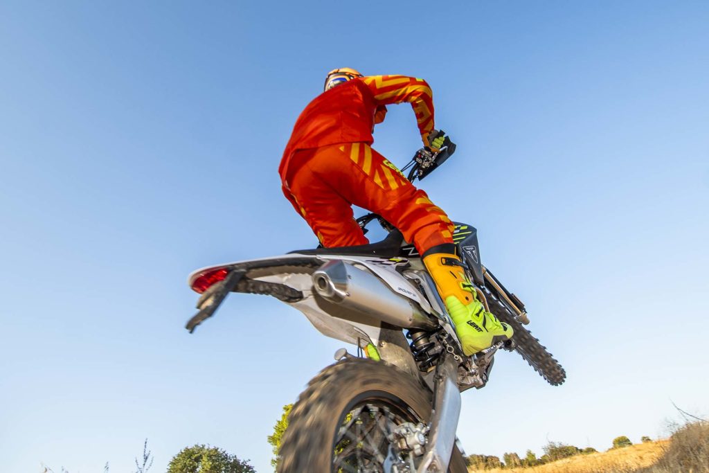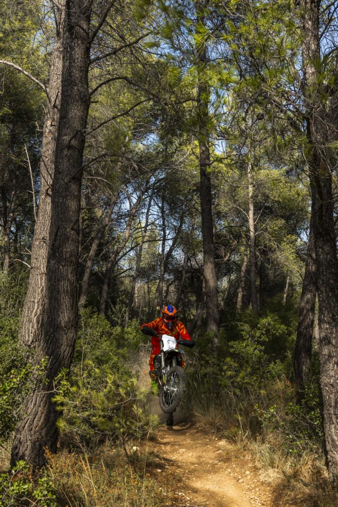 Στα (μικρά, η αλήθεια είναι) διαστήματα κατά τα οποία καταφέρναμε να οδηγήσουμε όπως θα θέλαμε (από τεχνική άποψη), αυτό που είδαμε στη σέλα του νέου TF 250-E είναι πραγματικά εντυπωσιακό. Η ευελιξία της μοτοσυκλέτας είναι εκπληκτική και χάρη σε αυτή μπορεί να ακολουθήσει με φοβερή άνεση ακόμα και τα πιο σφιχτά λούκια ή να στρίψει στο φλατ, πλασάροντας τον πίσω τροχό με χαρακτηριστική ακρίβεια.