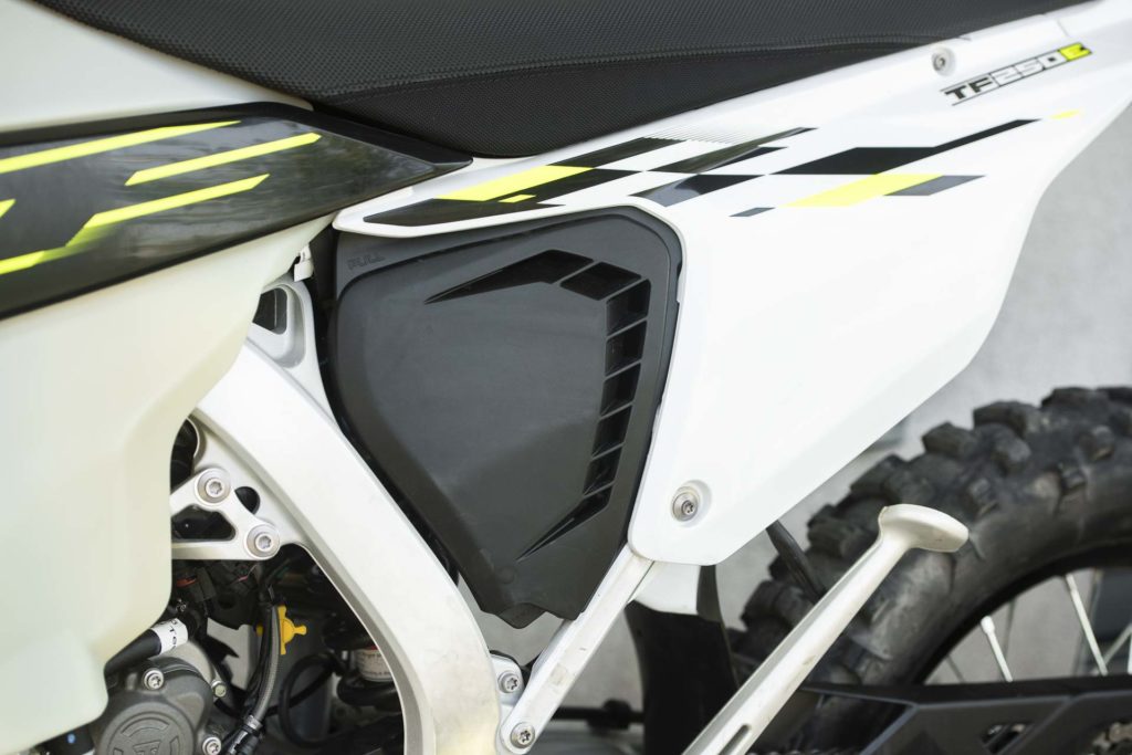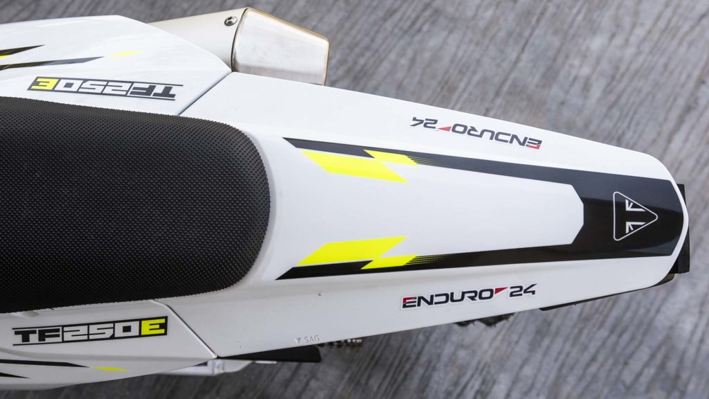 Η αίσθηση που σου δίνει “με το καλημέρα” το TF 250-E είναι πως έχει πολύ μαζεμένες διαστάσεις. Αρκεί να παρατηρήσεις τη σχεδίαση του ψαλιδιού και το πόσο πολύ αυτό ανοίγει, από τη μέση του και προς τα πίσω ώστε να χωρέσει τον τροχό, για να καταλάβεις το πόσο στενή είναι η μοτοσυκλέτα στην περιοχή γύρω από τον κινητήρα. Από τη θέση οδήγησης δεν σε ενοχλεί τίποτα και σίγουρα η σχεδίαση του ρεζερβουάρ είναι όσο το δυνατόν καλύτερη θα μπορούσε, ώστε να μην ενοχλεί η αυξημένη χωρητικότητα σε σχέση με το MX μοντέλο.