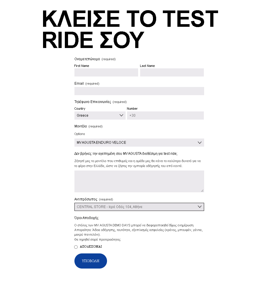 Μπείτε τώρα στο www.mv-agusta.gr, επιλέξτε το μοντέλο σας και κλείστε το test ride σας. Ζήστε την εμπειρία που δεν θα ξεχάσετε ποτέ.