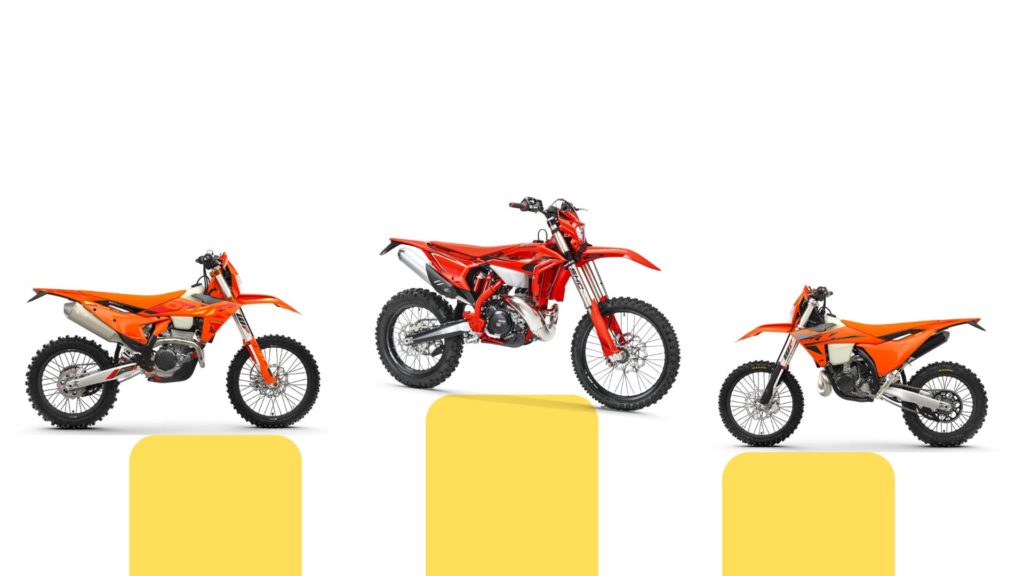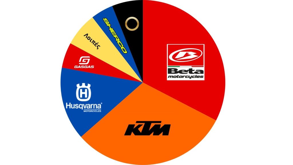 Η δίχρονη Beta RR 300 κρατάει τα ηνία στις πωλήσεις, με τις 350 EXC-F και 300 EXC της KTM να ακολουθούν με μικρή διαφορά. Για πρώτη φορά στο top10, ανάμεσα στα τετράχρονα (5) και τα δίχρονα (4) μοντέλα, βλέπουμε να μπαίνει “σφήνα” και ένα ηλεκτρικό.