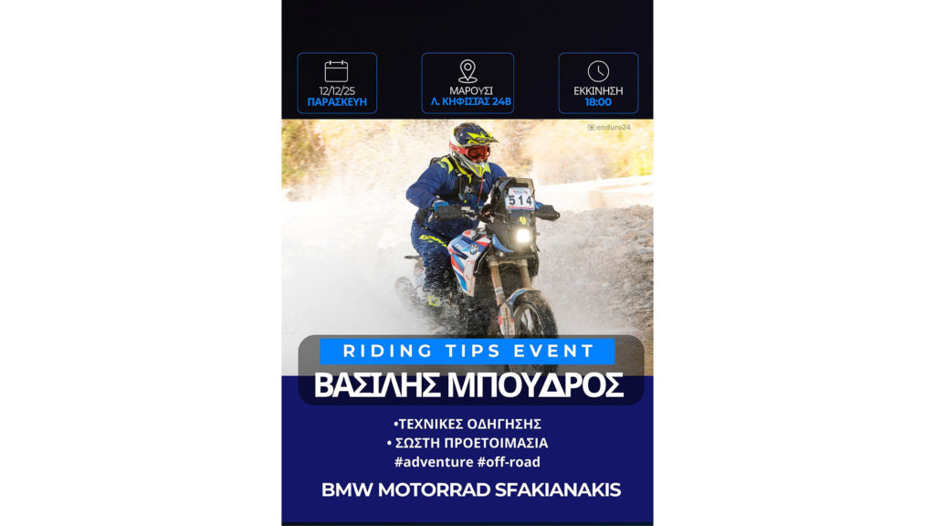 Την Παρασκευή 12 Δεκεμβρίου 2025, στις 18:00, ο Βασίλης Μπούδρος, επίσημος εκπαιδευτής και πρεσβευτής της BMW Motorrad Hellas, θα βρίσκεται στις εγκαταστάσεις της BMW Motorrad Sfakianakis στο Μαρούσι (Λ. Κηφισιάς 24Β), σε μια εκδήλωση ανοιχτή για τους φίλους της μοτοσυκλέτας.
