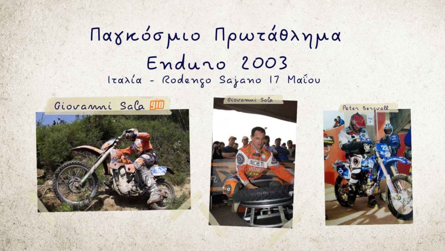 Ο Giovanni Sala μπορεί να χαρακτηριστεί ως ένας από τους κορυφαίους αναβάτες enduro όλων των εποχών. Και το λέμε αυτό όχι μόνο για τους πέντε παγκόσμιους τίτλους (‘93-’95, ‘98-’99) κατηγορίας (+1 Γενικής), τις τέσσερις νίκες σε ISDE αλλά και για την απίστευτα μεγάλη διάρκεια στην καριέρα του που μέτρησε 20 χρόνια (!) νίκες στο Παγκόσμιο Πρωτάθλημα και που συνεχίστηκε με εξίσου δυνατή πορεία και στο Rally Dakar όπου έφτασε μέχρι και το τρίτο σκαλί του βάθρου το 2006.