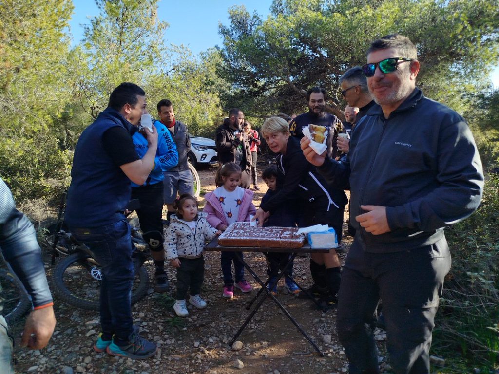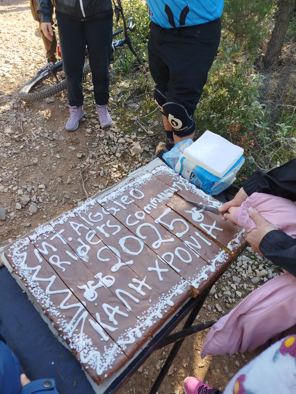 Περιμέναμε να μαζευτεί η παρέα -που πλέον είχε μεγαλώσει- και χαλαρά αρχίσαμε να ανεβαίνουμε προς τα πάνω. Ο ρυθμός και η διάθεση ήταν τόσο cool που κανείς δεν ενοχλήθηκε όταν μας προσπέρασε μια ομάδα που έκανε ορεινό τρέξιμο… Πάνω που πήγαμε να κουραστούμε μπήκαμε δεξιά στο Στριγκάκι Trail -ένα μικρό και παιχνιδιάρικο πετρωτό μονοπατάκι- που μας έφτιαξε την διάθεση. Τσουπ και πάλι στην κορυφή έτοιμοι και ζεστοί για το Γκρινιάρης Trail. Πρόκειται για το πιο νέο ποδηλατικό μονοπάτι του βουνού που ακόμη μπορεί να μην έχουν ολοκληρωθεί όλες οι κατασκευές, αλλά είναι τέλειο! Ειδικά με το φουλ τερέν της ημέρας ήταν σούπερ απολαυστικό και έτσι δεν διστάσαμε να το ξανακάνουμε. Μπήκε το τρενάκι με όρεξη, αλλά ένα λάστιχο έκοψε την φόρα του Μακρογιαννέλη. Ας είναι, τον περιμέναμε στον τερματισμό και αφού κάναμε ένα ακόμη Στριγκάκι πεταλάραμε πεινασμένοι για την βασιλόπιτα. Η Ίρις Λαγουδάκου είχε αναλάβει όλη την διοργάνωση και την κοπή της πίτας και ο Γιώργος Μακρογιαννέλης σάρωσε τα πάντα καθώς κέρδισε το φλουρί και τα δώρα!