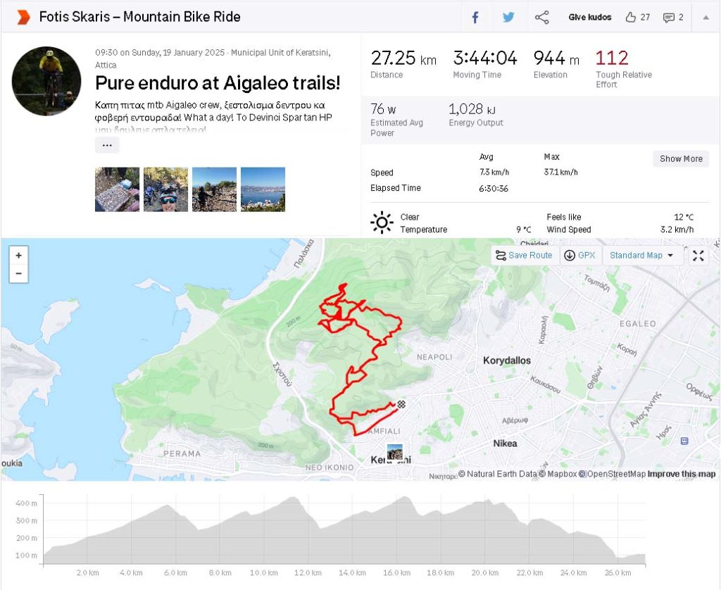 Λίγο άσφαλτοκαι έχοντας γράψει συνολικά 27,2km με 944 μέτρα υψομετρικής ανάβασης, βγάλαμε κράνη και μια βαθιά ανάσα απόλαυσης. Με τις ενδορφίνες στα ύψη είχαμε την αίσθηση ότι θέλαμε κι άλλο! Συνολικά περάσαμε πάνω από έξι ώρες στο βουνό και παρά τα αρκετά χιλιόμετρα και υψομετρικά δεν αισθανόμασταν εξαντλημένοι. Γιατί απλά ήμασταν cool και είχαμε καλή παρέα! Αυτό είναι ο ορισμός της εντουρόβολτας: βουνό, όμορφα μονοπάτια, καλό πεταλάρισμα, σούπερ παρέα και cool διάθεση. Αχ και αυτή η λιακαδάρα!